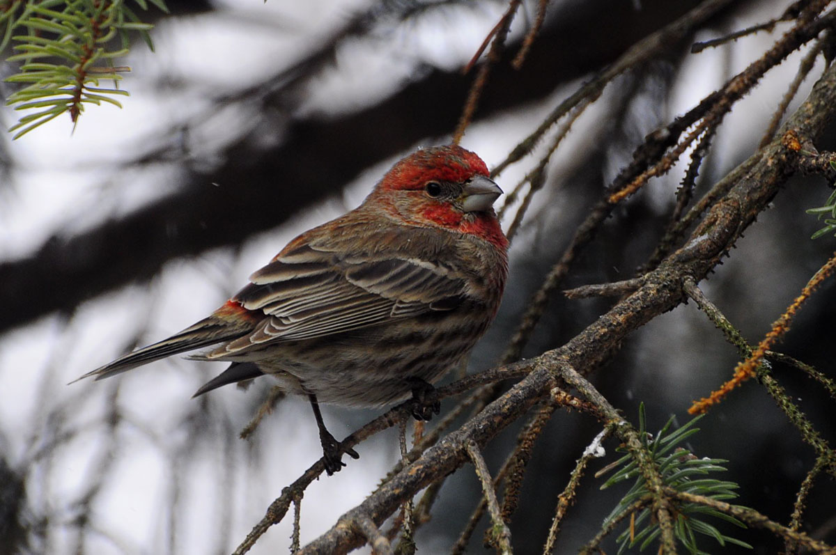 Nice shot. I spent many hours last fall trying to get a decent shot of one of our house finches but got nothing but red and brown blurs. I see them for a few seconds in our front bushes, but they flit away before I can get the shot setup. They don’t seem interested in any of the food which keeps the other birds in place.