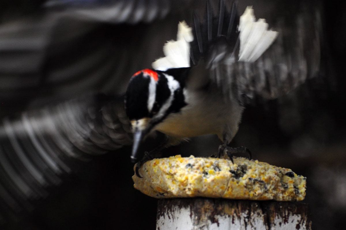 I swear, the birds who visit the deck need an air traffic controller. The large Scream of Blue Jays who have adopted us don’t have the slightest care of who they might be flying into, and in this case, upset the Hairy Woodpecker I was trying to shoot. I saw a Grackle this morning! Excitement – I’m very fond of grackles, but this one didn’t stick long enough for photos. A Robin was out and about today, too, on a day that snapped brittle and cold.