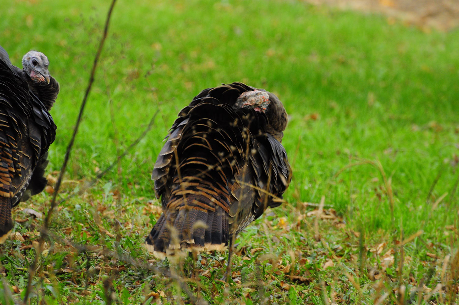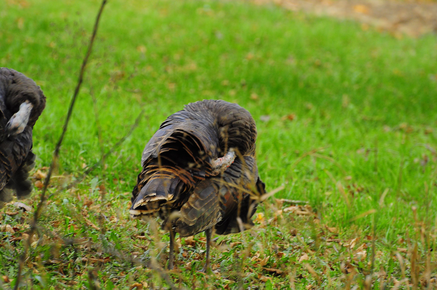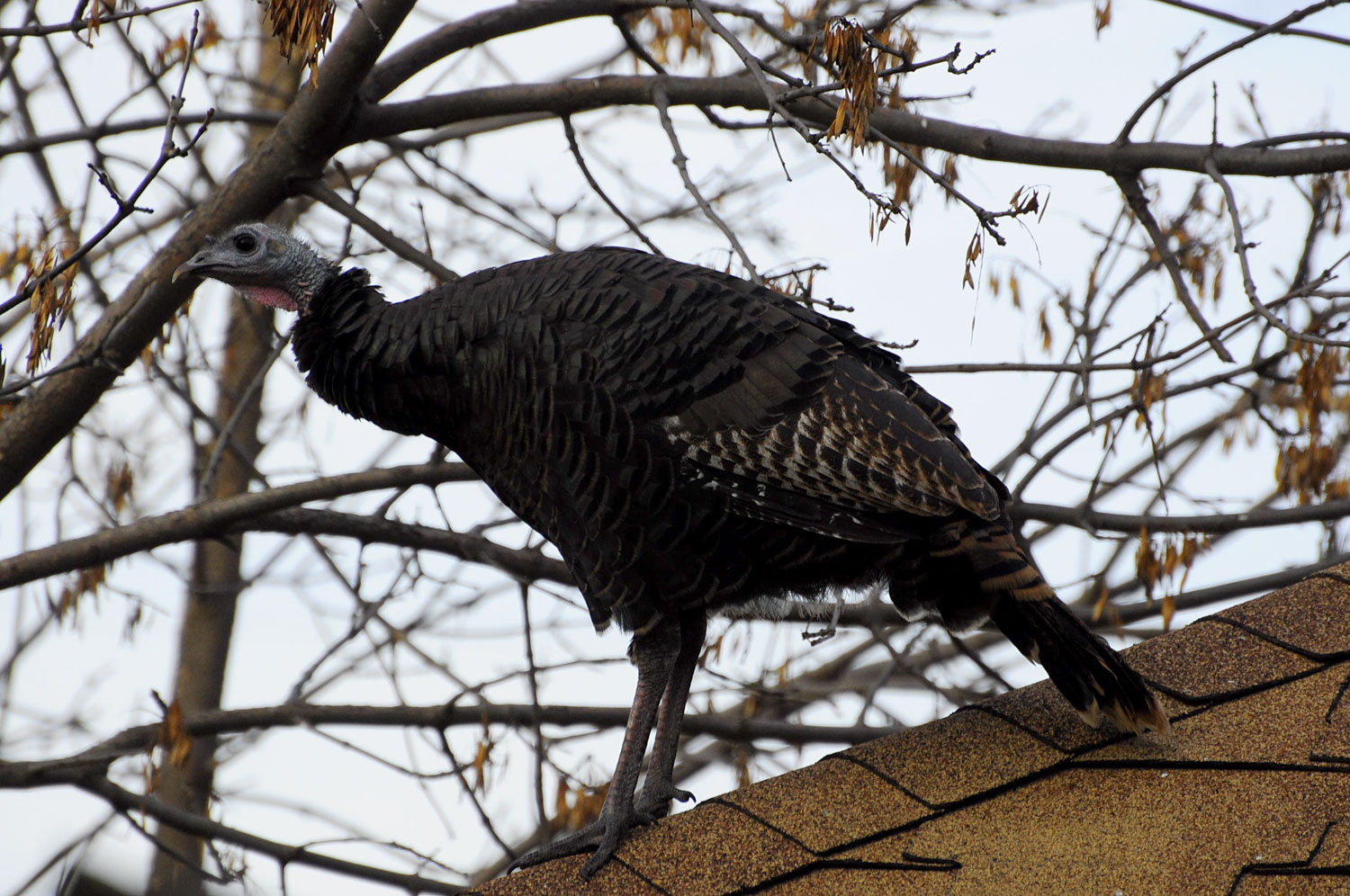 Our current wild turkey guests were on the studio side yesterday, on the neighbouring house’s roof, and running, playing, chasing each other for a while. These are more back to my usual bad turkey photos, but I was awkwardly hanging out my studio window, with them dodging behind trees, before they decided to calm down, groom a bit, then head back over to the front deck of our place. Click for full size.