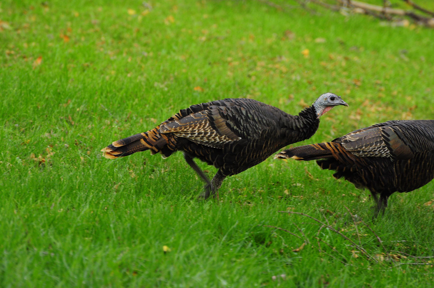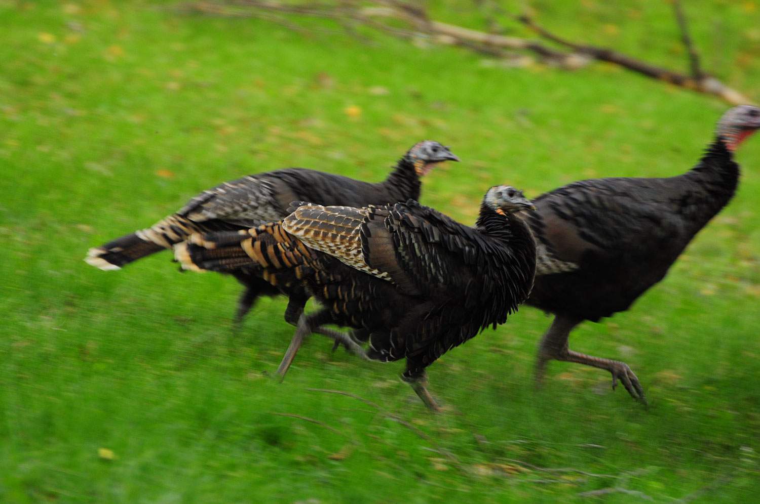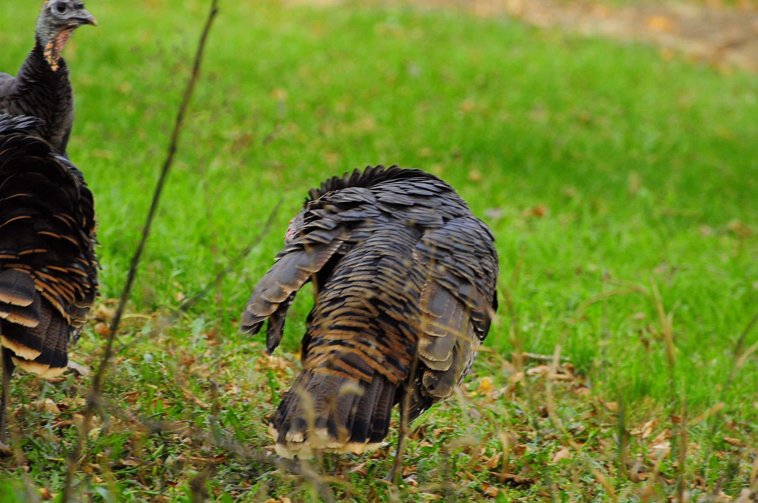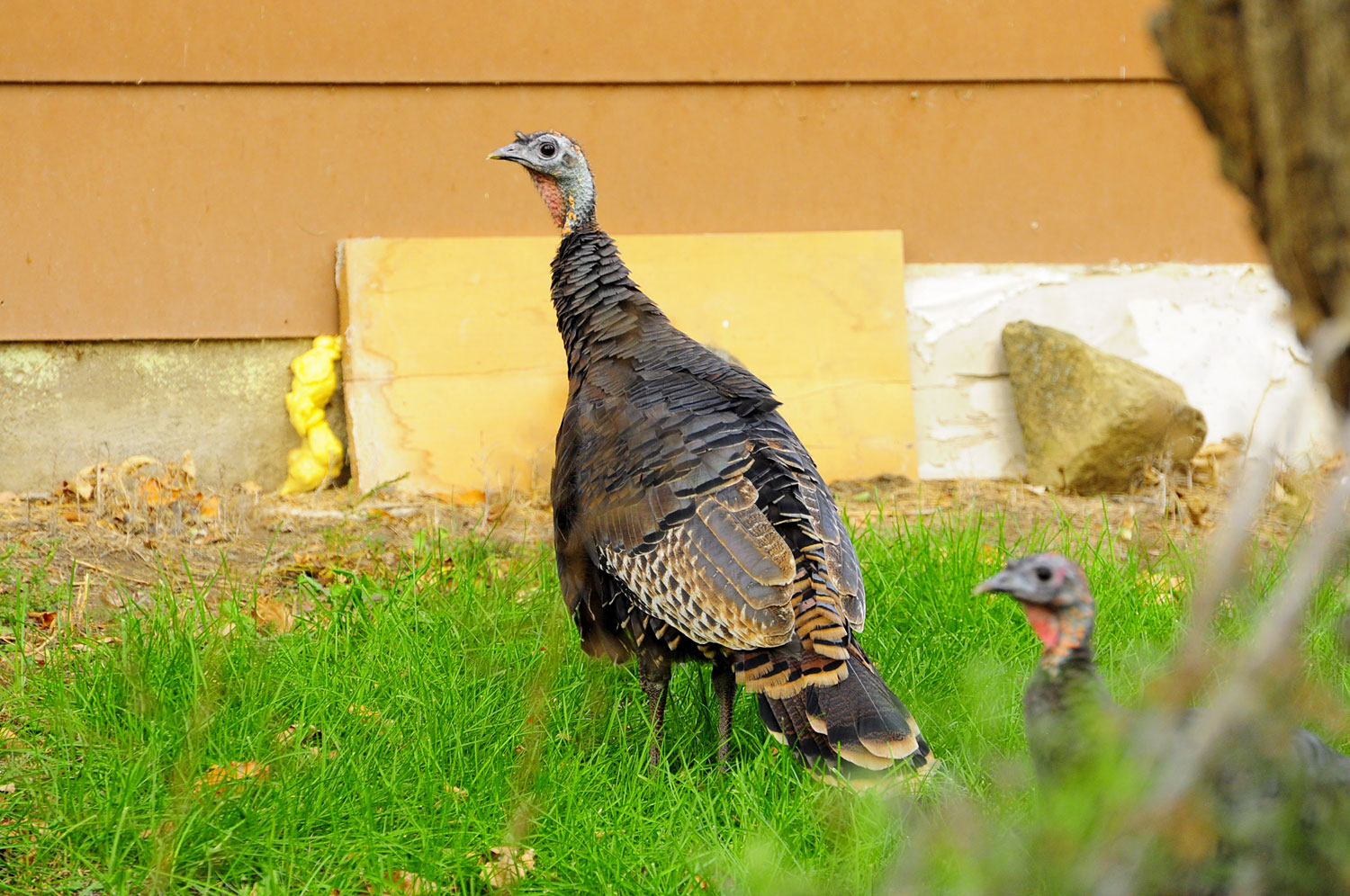 Our current wild turkey guests were on the studio side yesterday, on the neighbouring house’s roof, and running, playing, chasing each other for a while. These are more back to my usual bad turkey photos, but I was awkwardly hanging out my studio window, with them dodging behind trees, before they decided to calm down, groom a bit, then head back over to the front deck of our place. Click for full size.
