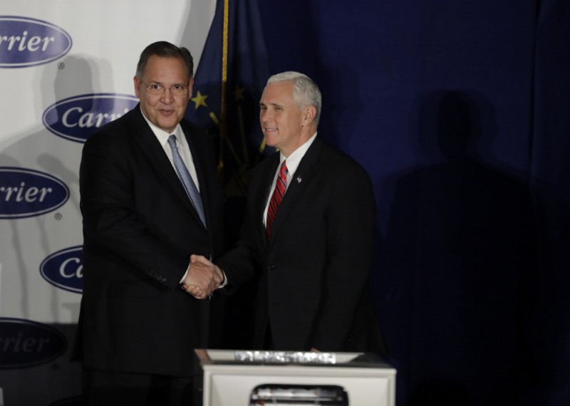 United Technologies CEO Greg Hayes shakes hands with Vice President-elect Mike Pence before Pence speaks at Carrier Corp Thursday, Dec. 1, 2016, in Indianapolis. CREDIT: AP Photo/Darron Cummings.