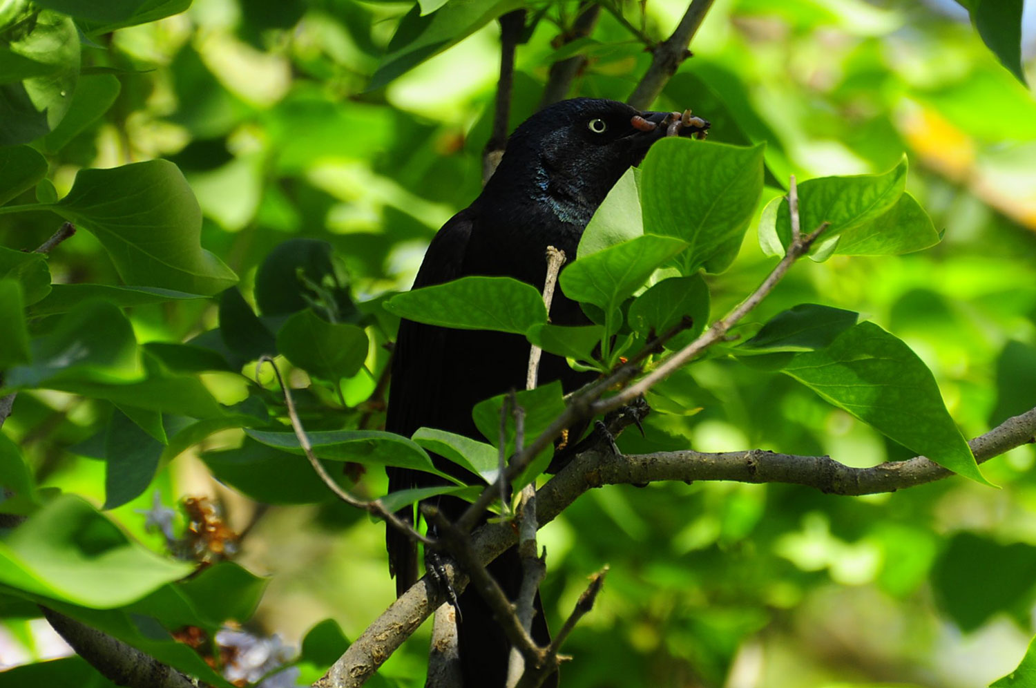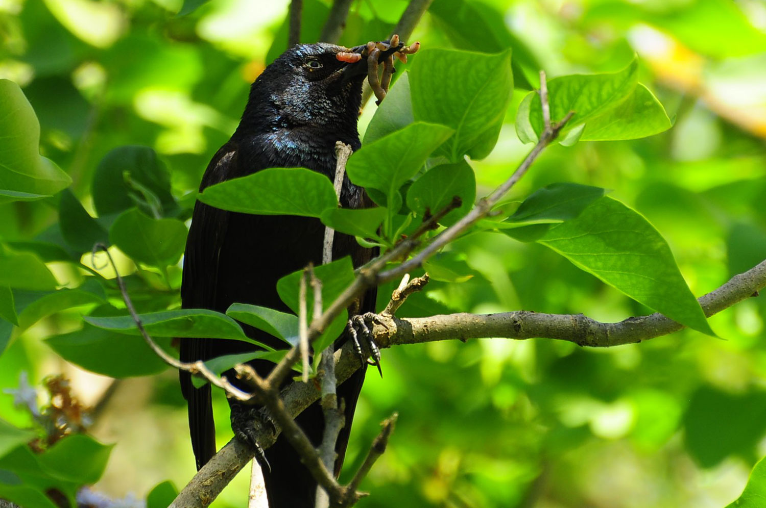 Grackles do love a tasty worm or three, but they are also intimidated by them, what with those tasty bits trying to survive and all. I’ve seen more than one grackle confused and baffled, after grabbing a tasty worm by one end, finding the rest of it curled around its beak. So, the general method is grab tasty worms, and keep ahold of them until near dead. Click for full size.