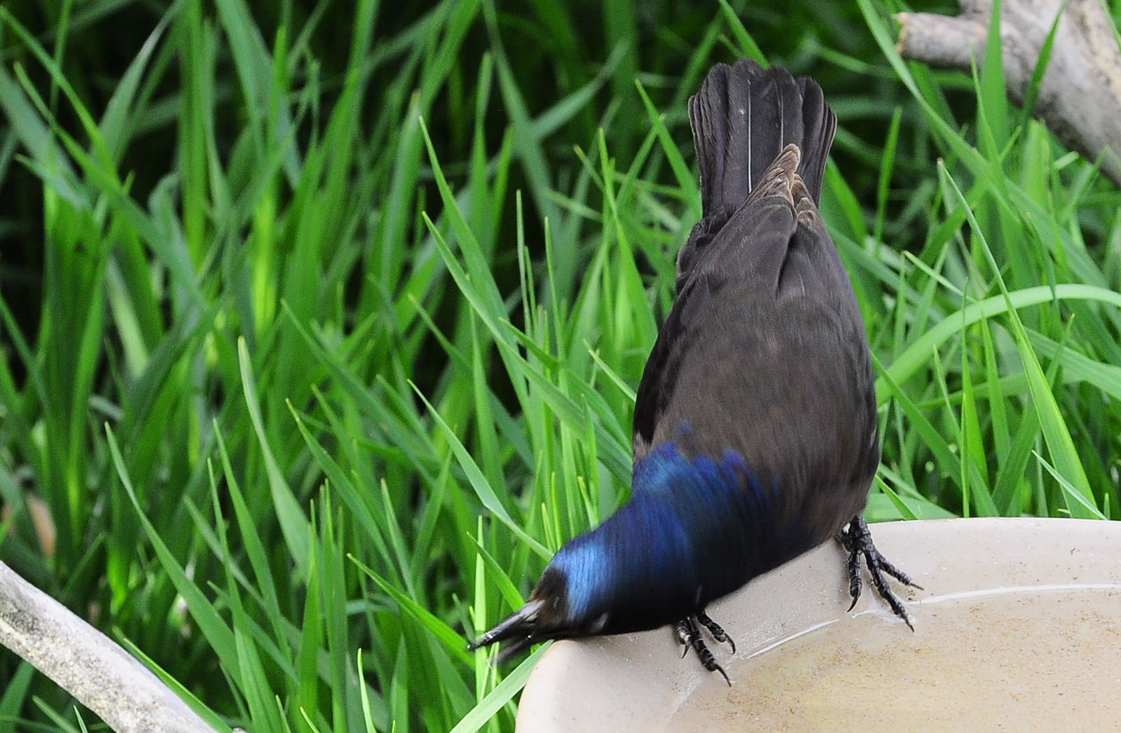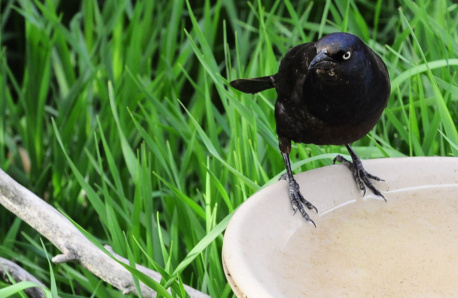 Grackle has a mouth full, flies down for a drink. Takes a moment out to glare at me for being so rude, then goes about having a nice clean. Click for full size.