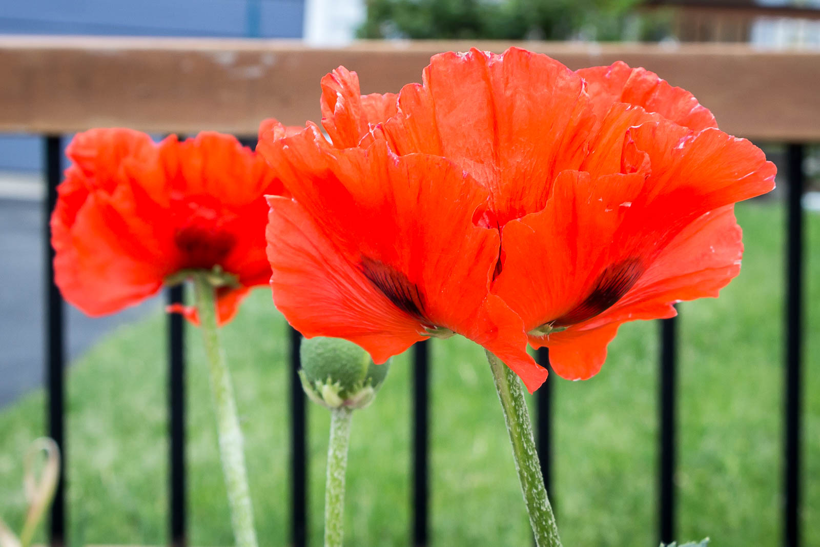 The poppies have opened and they’re beautiful, but I prefer the iris a few houses down. It has so many velvety shades of purple and they all point to that fuzzy yellow strip of pollen.