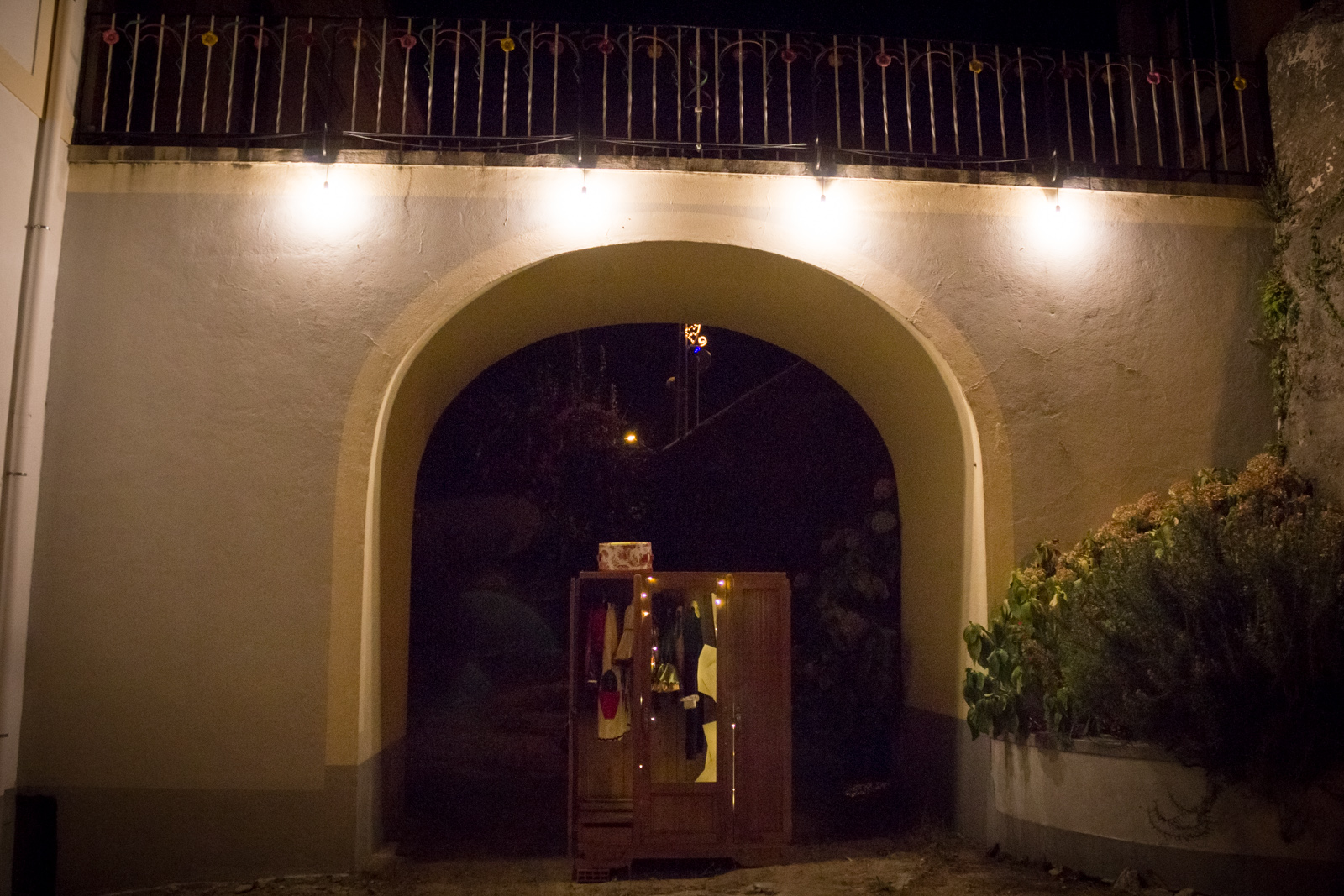 Two actresses will appear from behind the closet and uncover the memories kept there. On the left, apparel used in Midsummer Festivities from past years. Those are celebrated in Portugal with big parades, in which villages compete between each other with their singing, dancing, choreography and apparel. As expected, just whispering the tune of our village’s song was enough to get some of the public singing along and dancing. On the right, scripts of old theatre plays will remind people of how old our theatre tradition is. An actress known and dear to everyone will help bringing back some memories as she shares photographs of her younger self on stage, acting.