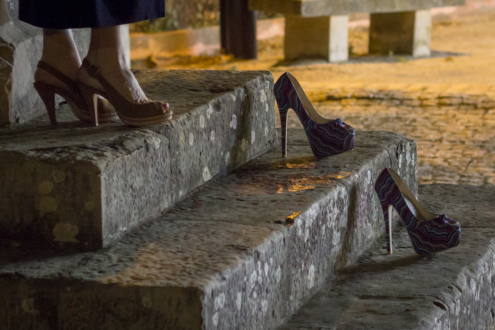 The play starts in the village’s fountain with a short scene where the public is invited to walk along streets they walk along everyday. The actress is barefoot through most of the scene and walks the shoes you see here with her hands. She introduces five guides and tells the audience which one to follow. Each group will walk down a different path, but they will all see the same scenes (just in a different order). Before leaving the public is left with a question… can this familiar place still surprise or move us?