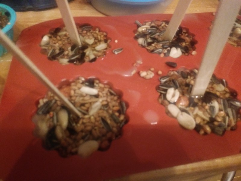 Anyway, I used to do similar things for feeding the birds, but I put the mixture inside a net (the durable plasticky ones that sometimes fruit or those little cheeses are packed in.