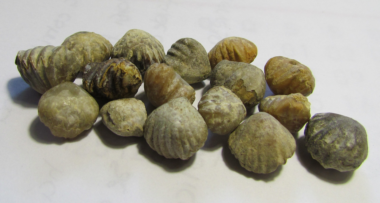 Brachiopod fossils are quite common here too, but when I got to the place where I usually look for them it was getting windy and cold and I decided it was time to go home. So here is a photo of some small brachiopod fossils I have collected over the years, photographed outside of their place of origin.