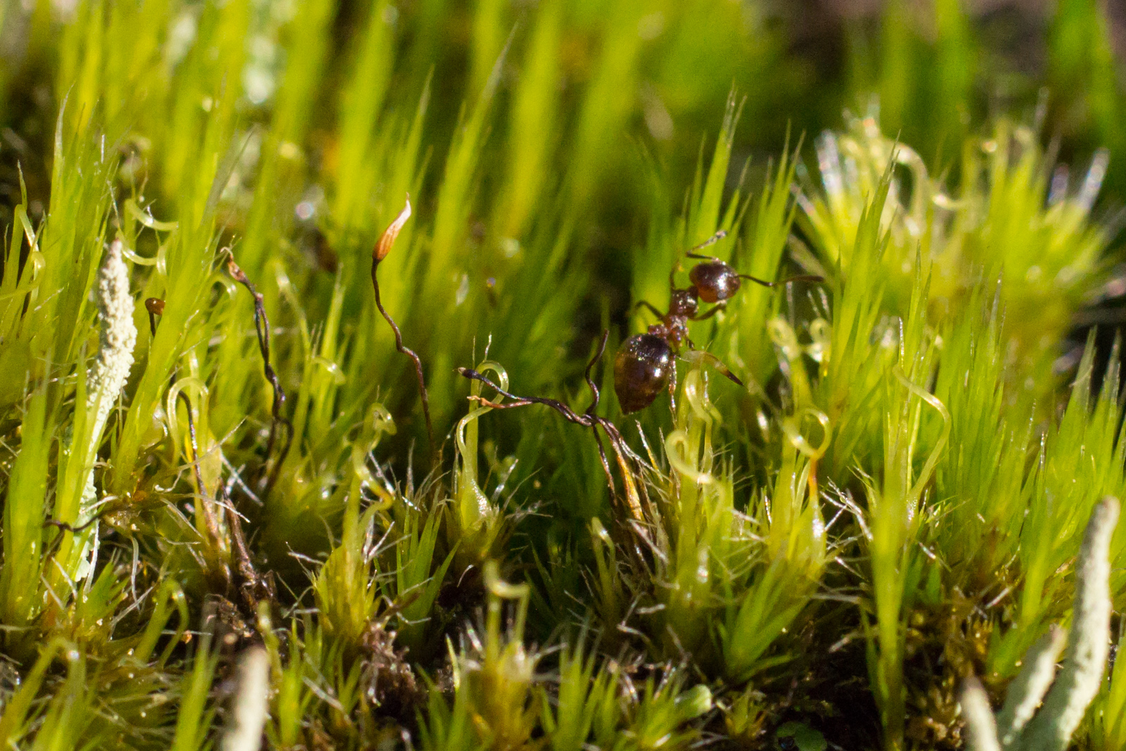 I love the mushroom and the caterpillar. Also in the first, the light is beautiful and the rock and the moss that looks like pine twigs (with green leaves)* are very fine looking.