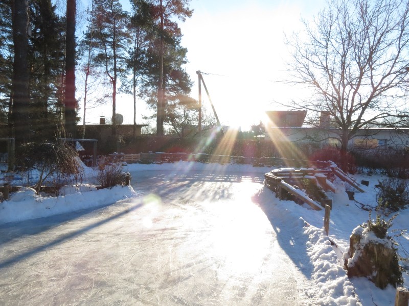 Well, to Ronja’s great joy, we have now had about two weeks of plus weather, and the skating rink resembles… a giant puddle right now. One last look at the before:
