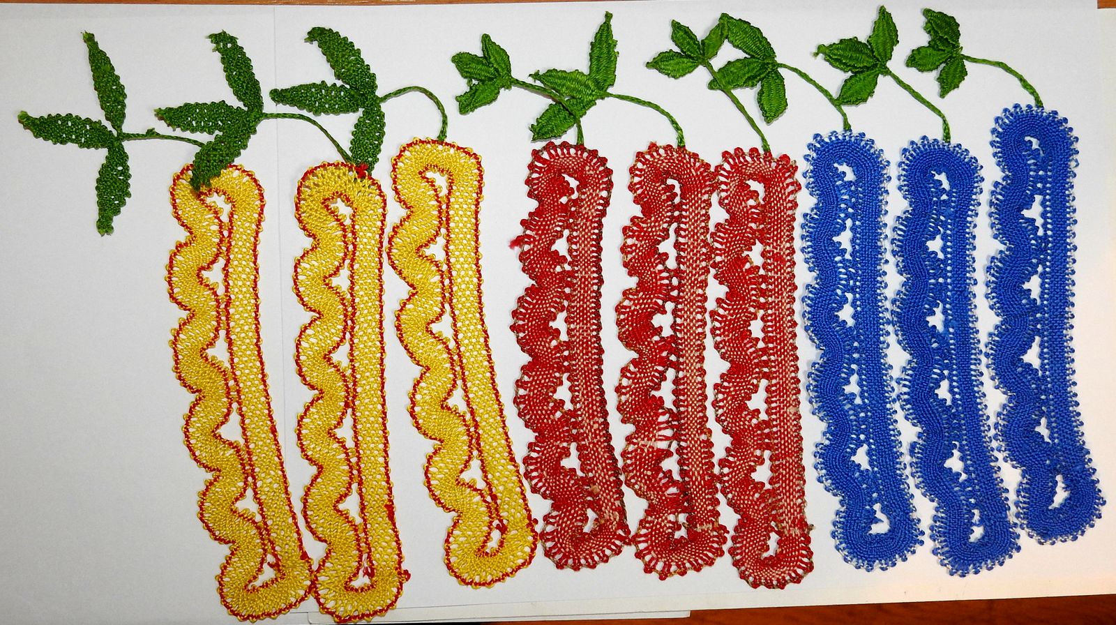 The red and blue ones are made with technique “plátno” (canvas). I started with the red ones, that s why those have three different colors in them, so I can easier keep tracks of the various threads. On the blue ones, I was more confident so the body is made entirely of blue with just the outer line white. The yellow ones are made with technique “polohod” (half-throw) and are the last ones I have made. I already knew sort-of what to expect and the colors were chosen for the looks.