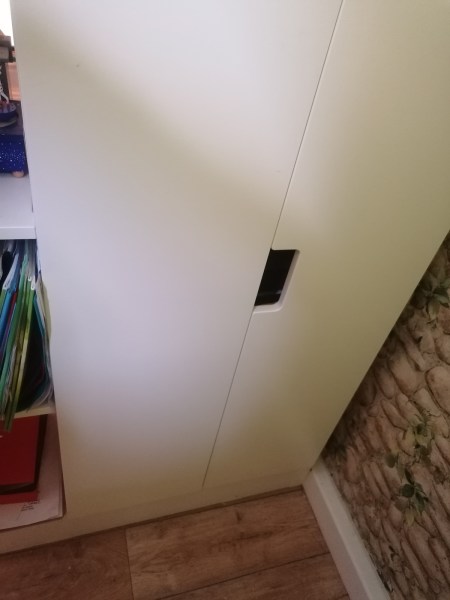 Estelle is also generally very shy and quiet. She doesn’t yet take treats from us and cusses me out whenever I try to offer her some. And she’ll just sit motionlessly in a corner when there’s something she doesn’t like, so while the Little One came downstairs for my help, she somehow got into that wardrobe and stayed very still. After we finally found her, we had to get her back. In the end I caught her and she very much did not agree with me.