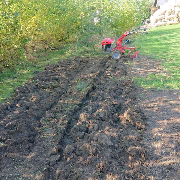 An acre is allegedly the amount of land that a man with a plough and a team of oxen can till in a day. It took me almost two hours to till these approximately 25 square meters, so I am woefully inadequate. Reasons for that are several – my tractor is nowhere near as powerful as a team of oxen, this was the first time the ground was being tilled in probably over a century, so I had to go over it three times in different directions, and it is small, thus I lost a lot of time turning around. One of the reasons why old-school farming was done on strips of land, not squares of land, was that once the oxen (tractor) were on a line, they could follow it for a reasonably long time.