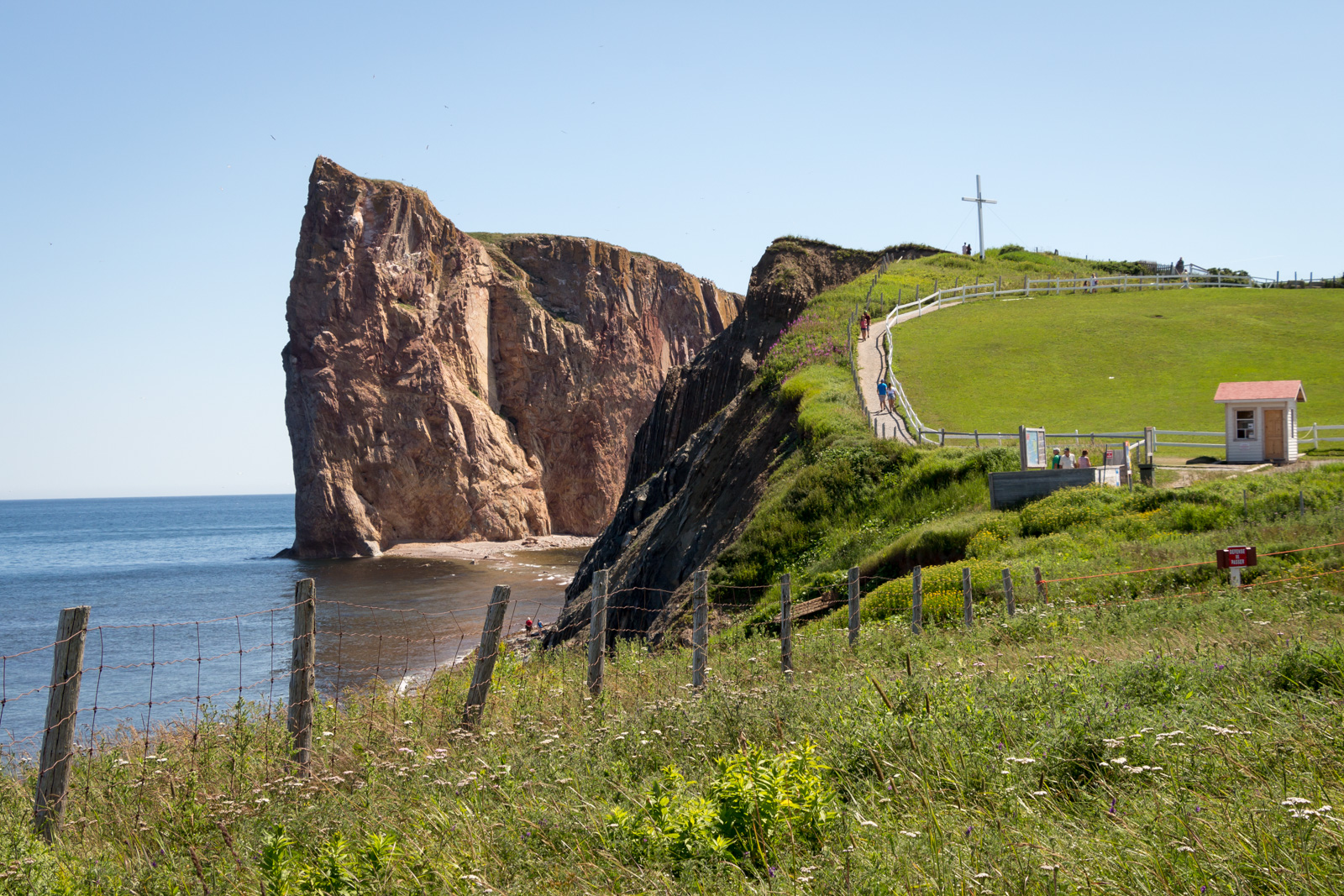 Well, it’s not raining. In fact, it’s a hot, sunny day here which just goes to show that weather forecasting is an inexact science. Jack and I haven’t gone for a walk today partly because of the heat and partly because Jack got a bit over-excited last evening while playing with his best friend Leo (who is only 4 and half Jack’s size) and he’s limping a bit on his right back leg. It’s not serious, Bubba has a bit of arthritis in that hip and sometimes it gives him a bit of grief. Maybe tonight when the temp goes down a bit (it’s 30° C right now) I’ll take him down to the end of the street and back, but for now Jack has positioned himself in front of the A/C vent and is happily asleep. Our photo today is where Jack and I wish we were. This is the beach across the street from my mother-in-law’s house in Perce, Quebec.
