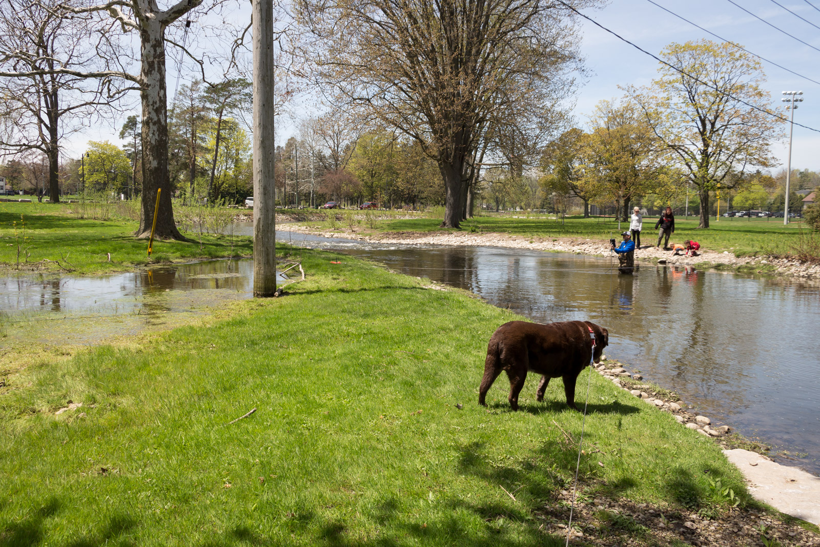Can anyone tell me what the man in these photos is doing? Jack and I encountered him at our local park yesterday. He was slowly walking from one side of the creek to the other along a measuring tape laid out between the banks. He would move a step or two and stop, then fiddle with his machine and look up to the sky for a while and then fiddle with his machine again until he was satisfied with something and then he’d take another step or two and repeat the process. At the rate he was moving it would take him an hour or more to cross our wee creek. I suspect it’s related to the flooding you can see in the first photo. Two years ago they removed the concrete barriers lining the creek and naturalized the banks. It was an all summer long project and it was quite picturesque when completed. Since then, though, the area around the creek floods easily and essentially makes large areas of the park unusable.