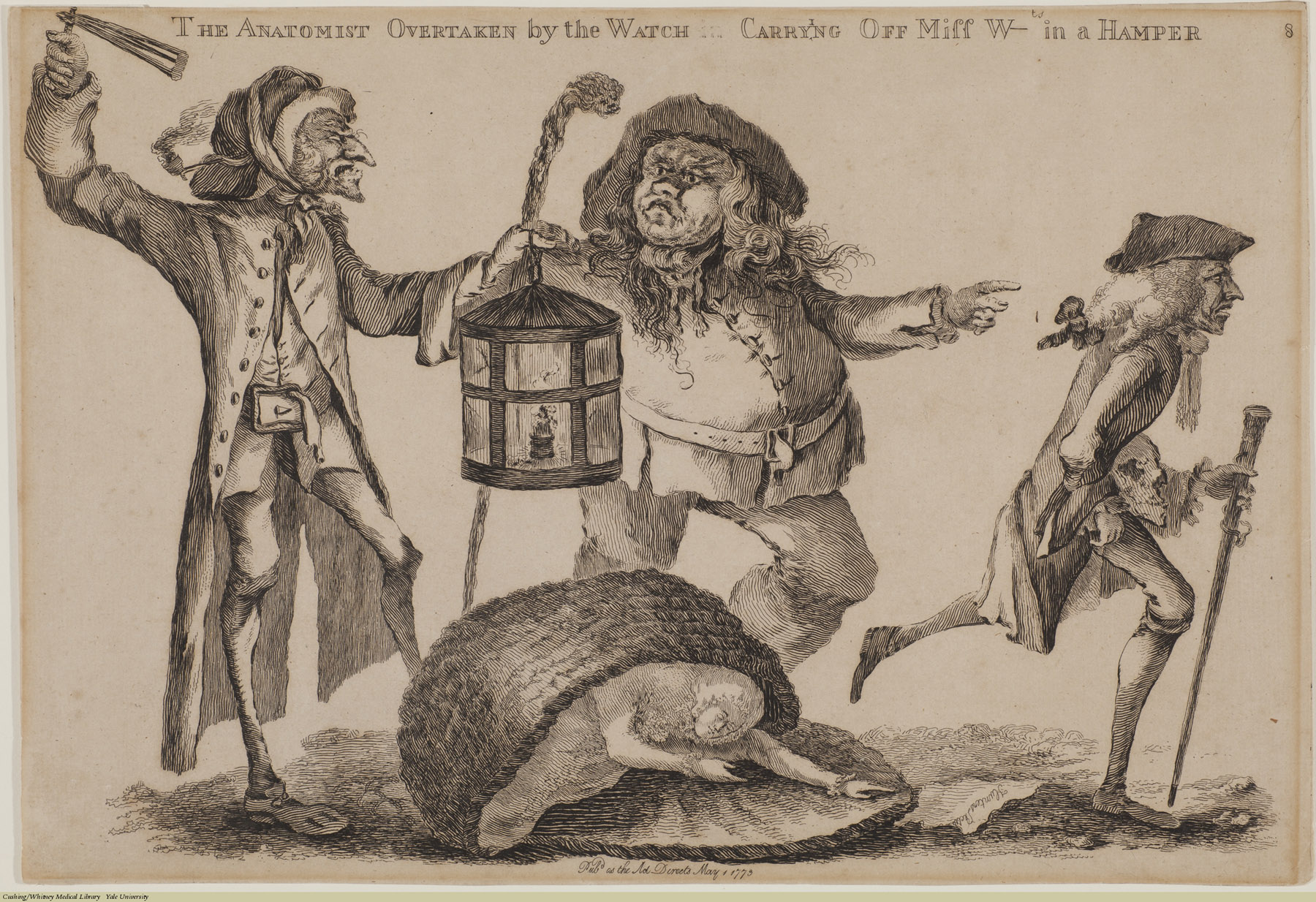 The Anatomist Overtaken by the Watch in Carring Off Miss W- in a Hamper. William Austin, Etching, 1773. Subject: Graverobbing, William Hunter.