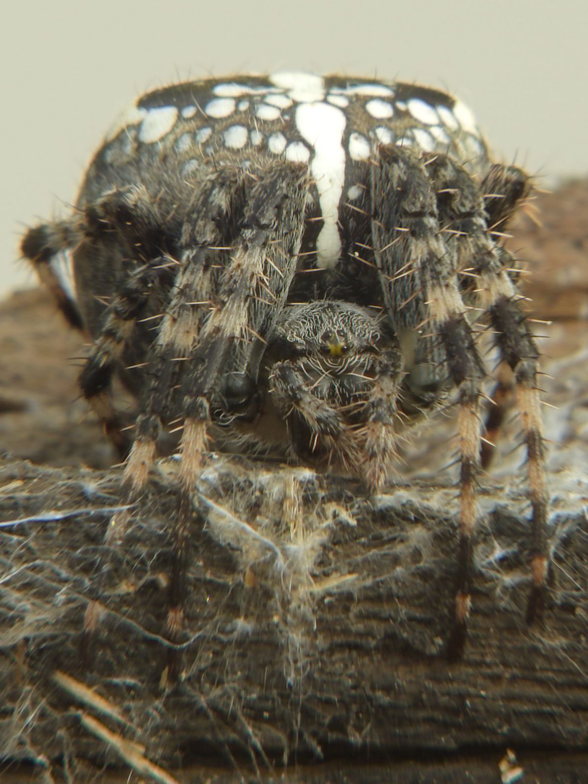 I was moving old woodpiles closer to the house for winter and sorting some old planks for sawing, when suddenly I found this huge orb weaver on one piece of rotten wood. I put it carefully in a place where I could take pictures and it was kind enough to stay in place long enough for me to fetch my camera, and my PC today obliged to getting its act together for long enough for me to correct the pictures for posting (my homemade macro lens has, unfortunately, strong chromatic aberration).