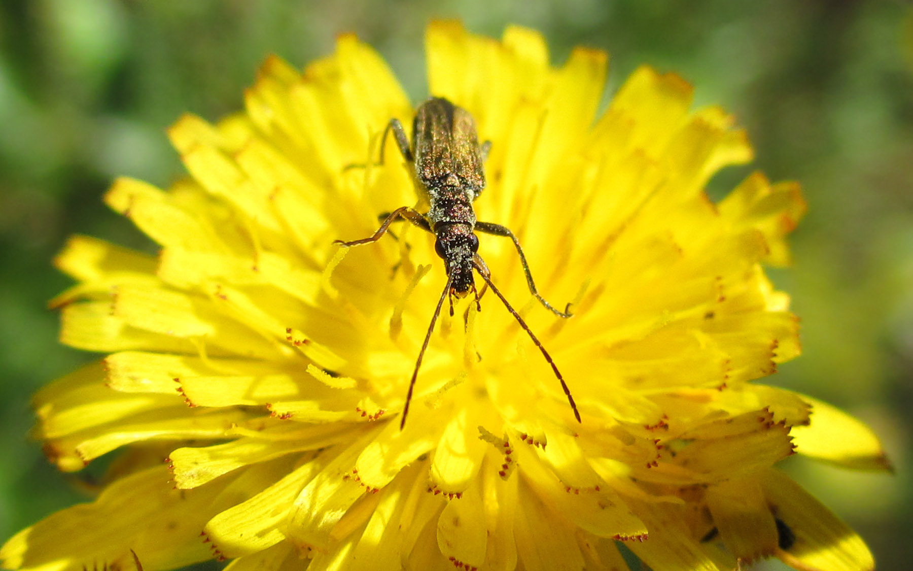 A beetle I’m unable to identify on a yellow hawkweed flower. Click for full size!