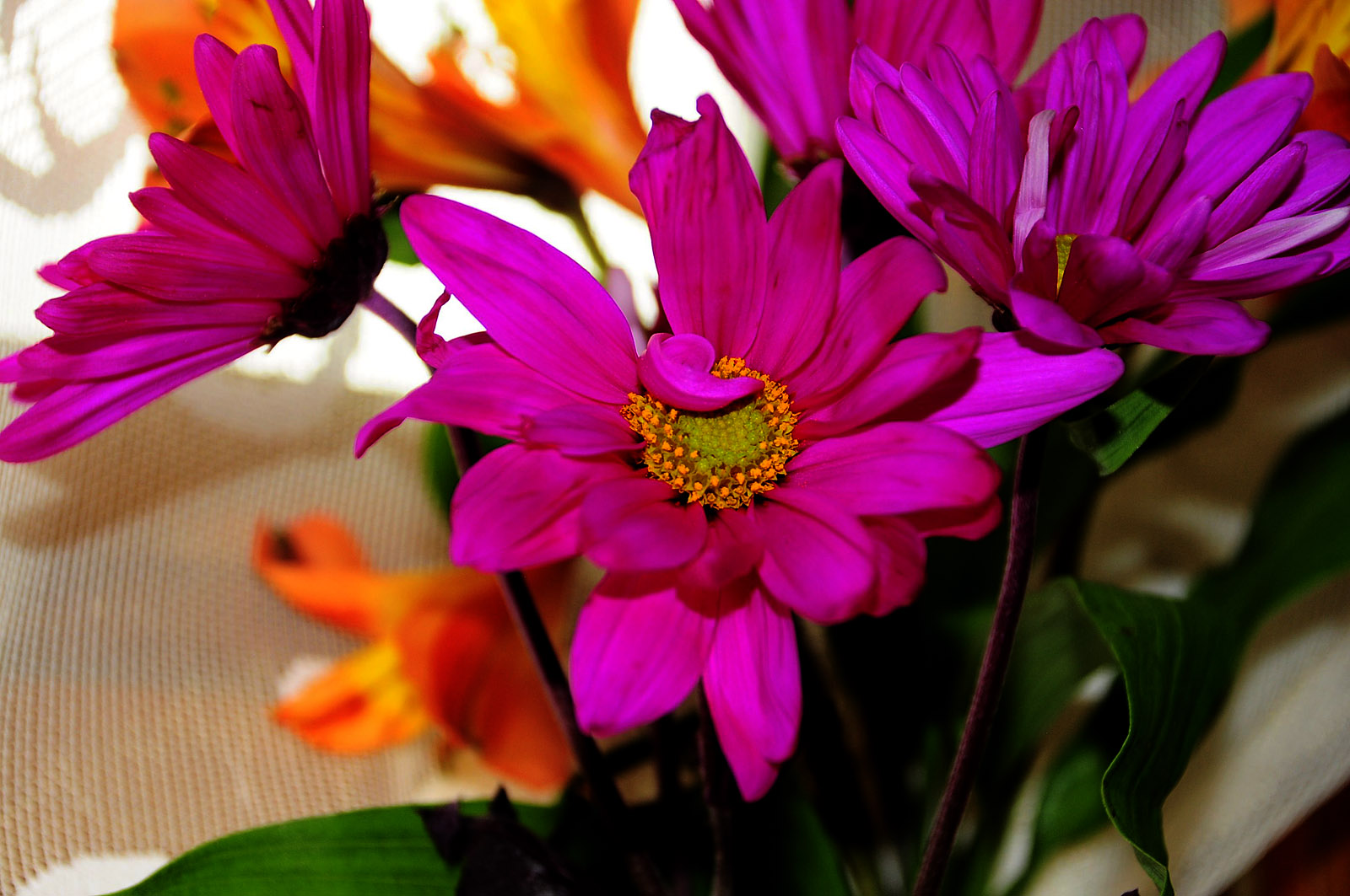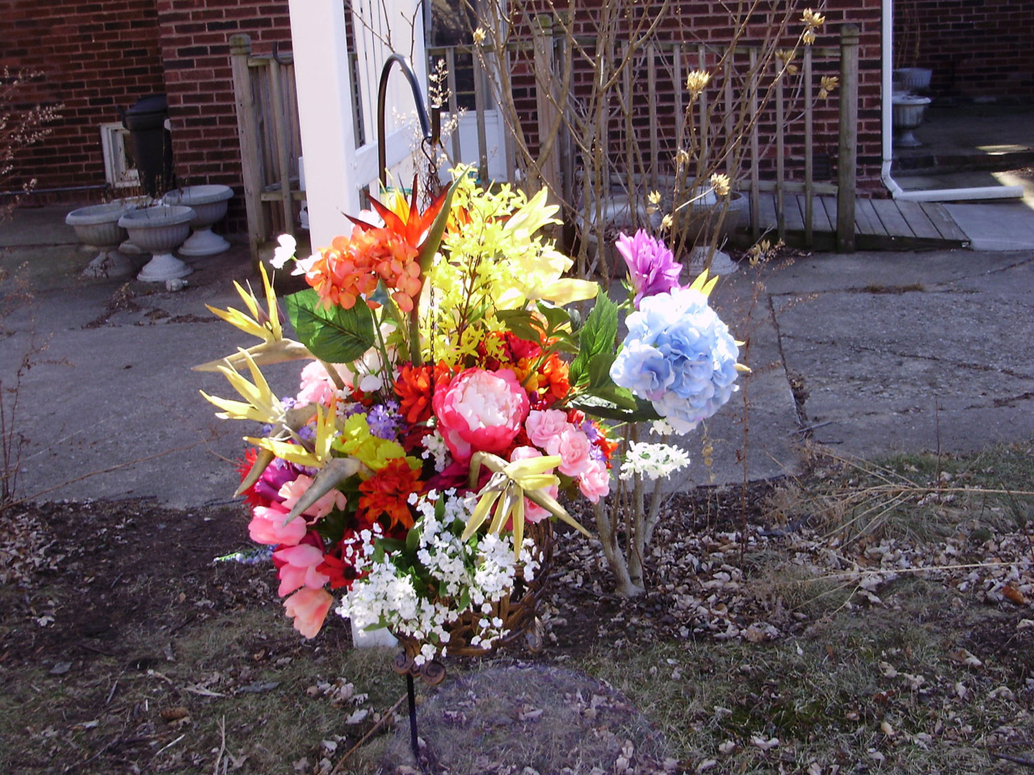 From Nerd of Redhead: From Nerd of Redhead: colorful flowers in an urn for the Redhead’s grave display. The urn is cast aluminum with hummingbirds on it. The flowers represent those in the yard, those she liked (birds of paradise), or something that just looked good to me. A celebration of the color she brought to my life. So beautiful, click for full size.
