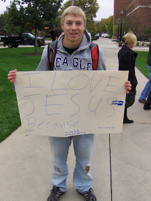 I love these stories you write. As a spanish undergrad I find them so exotic. Is this representative? I mean do young people in America really care so much about this stuff? I'm asking because if some guy walked around holding a sign that says "I love Jesus" in my college, everyone would hurry to the other side of the street thinking "lol, what a huge dork". "Ho hum" or "Meh. I don't know. I don't care. Whatever." could very well be the average response to the whole god thing around here.