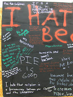 No, this isn’t some religious rant from me. A religious student group at Purdue, InterVarsity Christian Fellowship, invited me and other members of the Non-Theists to an event they were holding today on Memorial Mall. They had a black board with “I HATE RELIGION BECAUSE…” written in large red letters, and invited students to write their opinions on the board.I ended up talking to some of them for a while (even though it was really cold outside, boo Indiana weather), especially the pastor who works with the group. He explained that they wanted to generate discussion about religion so they could learn from the different viewpoints and think about why some people dislike religion. Much like our Blasphemy Day event, they wanted to let people know it was okay to criticize religion – in fact, they encourage it. They don’t want people to blindly accept what they may have grown up with, be it Christianity, Islam, Hinduism, atheism. College is a place to question things and learn about different beliefs, and that applies to religion as well.