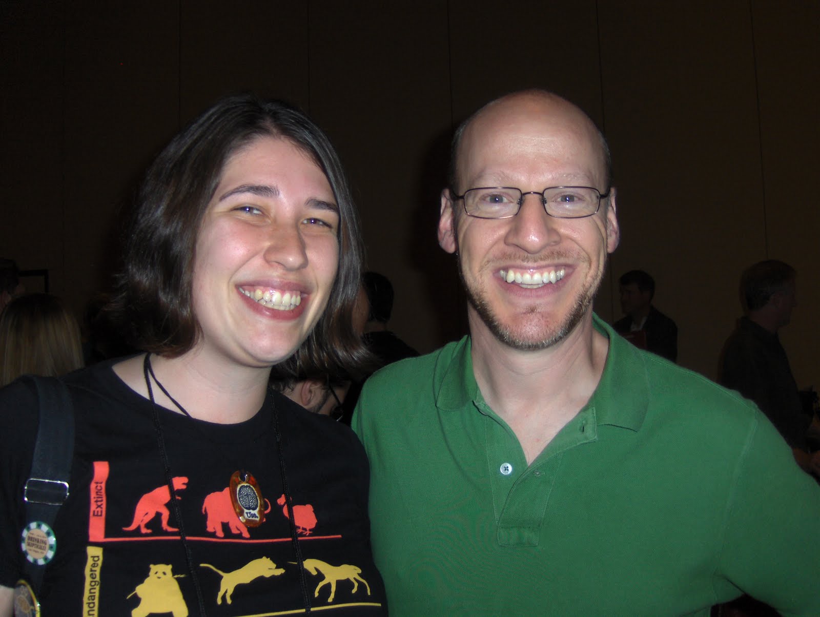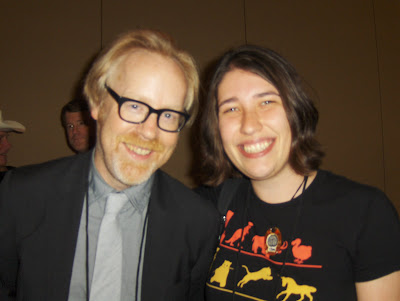 At the opening reception, I ran into my friend Ashley Paramore (fellow Secular Student Alliance board member and videoblogger healthyaddict), who is about a million times more social than me. Actually, this is probably an understatement. She proceeded to take me around and introduce me to people, and helped me work up the nerve to go take a photo with Adam Savage of Mythbusters fame.I actually had to go back and take a second photo (the one above) because my camera is being held together by duct tape and fell apart before the photo could save. Thankfully Adam was nice enough to do another.