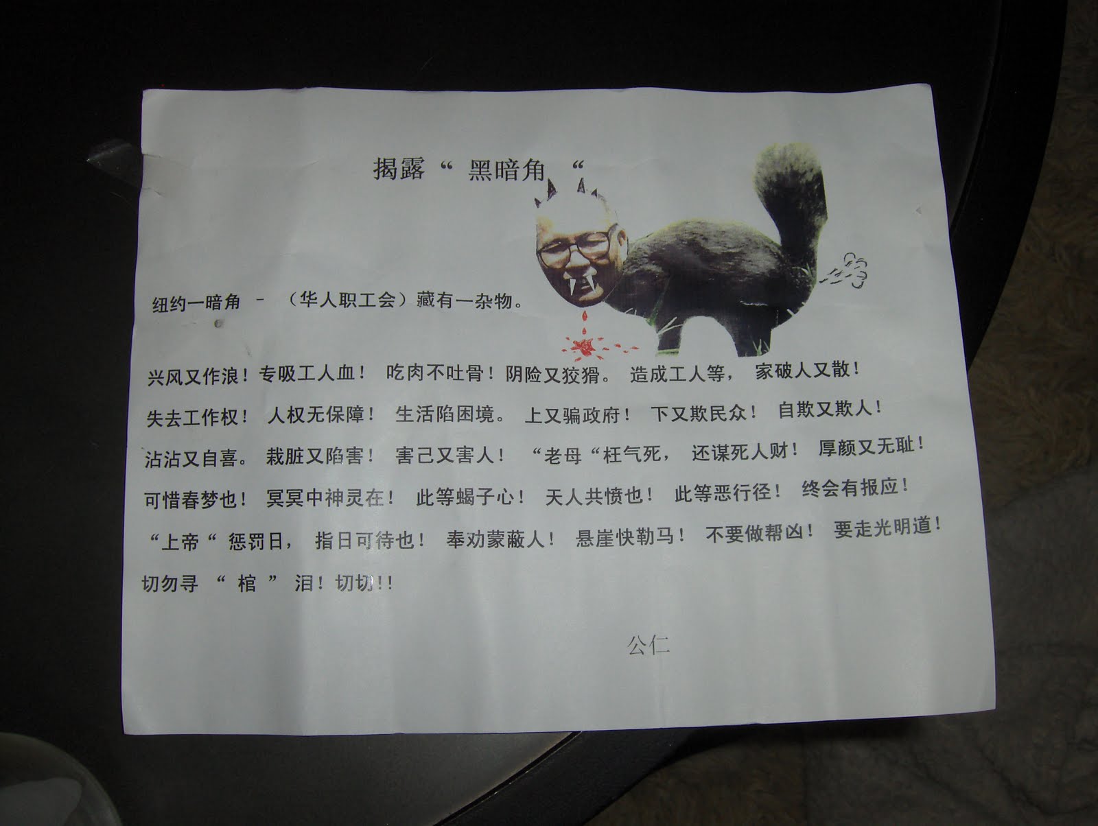 Since I’m drunk and jet lagged, I will give it a try (it’s in Chinese FYI) Essentially it’s “exposing” the guy in the picture, for allegation of corruption and incompetence etc. since the thing is pretty straightforward, I will try and translate it literally or else it’d just read like “I don’t like him”.Title: Exposing the “dark corner”New York – Dark Corner (Chinese Worker Association) has a hidden monster (editor: it’s very vague and hard to translate, literally it means “miscellaneous item”, whatever.) *picture goes here*.Raising wind and make wave, only sucking the blood of workers!Eating meat without spitting bones! Shady and cunning. Making workers wait, leading to broken homes and splitting families! Losing the right to work! No guarantee for human rights either! Life(s) has/have sunk into a mire. Lies to the government on top! Lies to the people on the bottom! Lies to himself and others! Yet proud of himself. Hurting others while hurting himself! “Mother” has died from anger, yet still trying to make money from dead people’s wealth! Thick face and shameless! Pity it’s a spring dream (i.e. short-lived)! In the world of spirits (difficult phrase to translate), there are gods and ghosts! This kind of scorpion heart (i.e. evil)! The heaven and people are both angry! This kind of evil deed! There will be karma! The day of punishment from the “heavenly emperor” (note: same phrase in Chinese shared between the Taoist God and Christian God), can be counted with fingers! An advice to the blinded man! Hold your horse before the cliff! Don’t be an accomplice! [You] should walk the path of light! [You] should never only cry when you see your coffin! Remember that!A two-character name that is the homophone to “worker” but means fair, equitable or public, and humaneness, benevolence, kindness.Post-translation note: It’s written in a strange semi-poetic form, full of Chinese idioms and set in a 5 character format, which is typically seen from old-fashioned people or graffiti from crazy people.