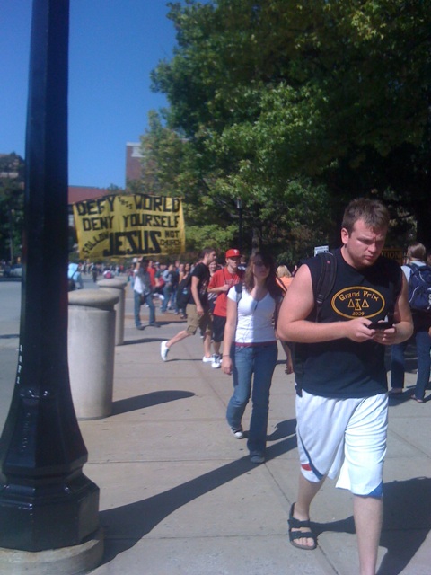 This is what Purdue’s campus looked like last Monday:Crazy campus preachers are fairly typical in the fall. One, it’s still warm, which is conducive to standing around outside yelling at people. But two, they hope to prey on the confused and lonely freshman. Because, according to this group, going to college is the work of the devil: