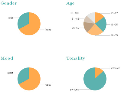 Call me a killjoy, but this sounds similar to that “What writer do you write like” thing from a few weeks ago that *shock* turned out to be crap. Without even looking at the site, I’m guessing the ‘female’ part is picked by how often the writer talks about female issues, and the age range perhaps relies on pop culture references. But that’s just a wild guess off the top of my head.Because really, what algorithms or criteria could be used to determine age or gender? Looking for specific keywords and doing some sort of cold-reading sounds incredibly plausible to me.And I think the ‘maturity’ label is iffy for you Jen :p