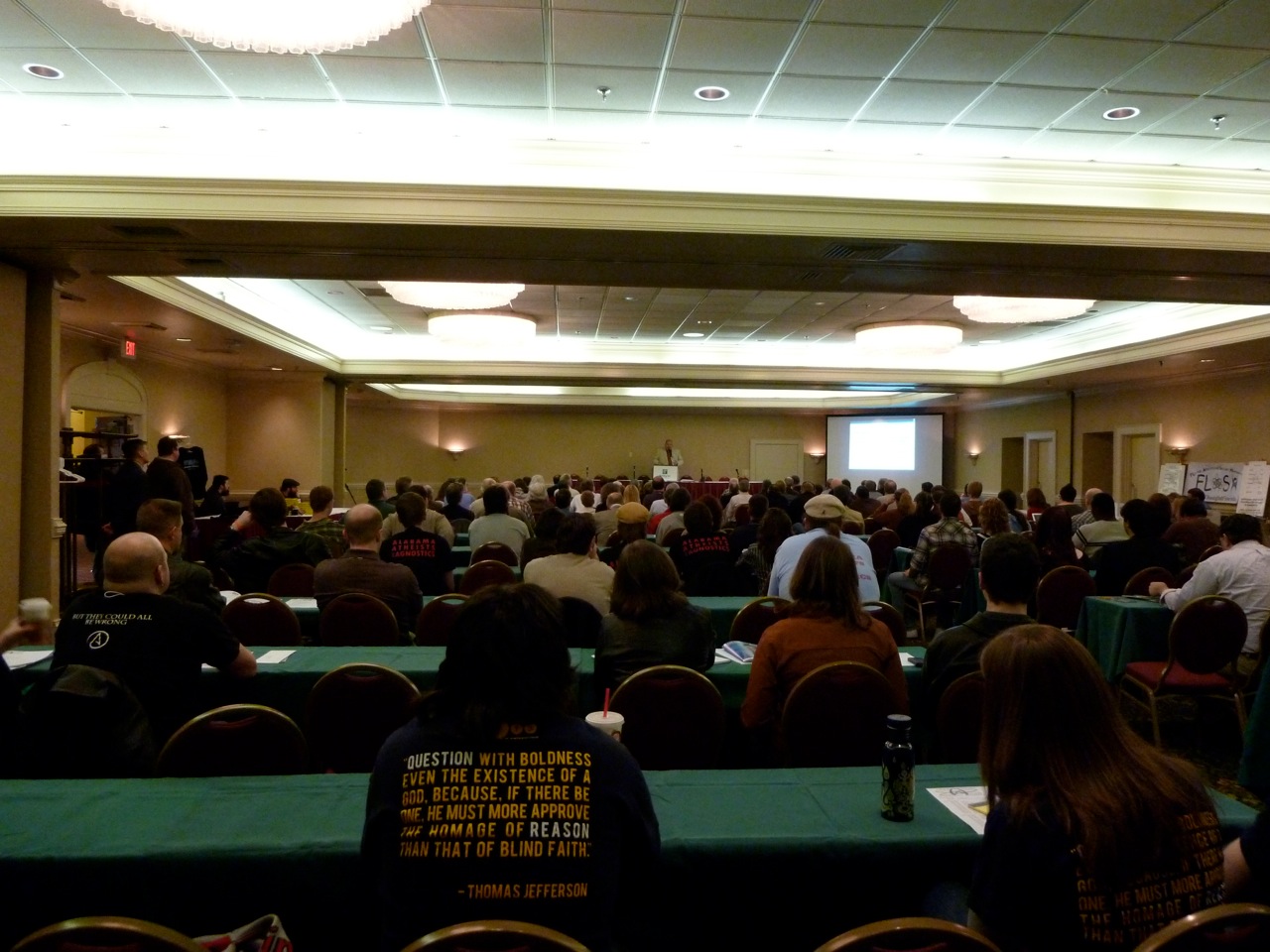 Last weekend Lyz and I were at American Atheists’ Southeast Regional Atheist Meet in Huntsville, Alabama. This is the first regional conference America Atheists organized and the over the two prior days, it sold out with 200 atheists from as far away as North Carolina and Ohio. At a rough visual estimate, probably 30% of the attendees were women. When David Silverman polled the audience on Sunday afternoon, for about half of those in attendance, this was their first atheist conference of any kind. Clearly, American Atheists is on to something.Sunday morning’s first session was an “Attendees’ Choice” panel discussion, featuring five local group leaders. Attendees were asked to submit written questions ahead of time, and the most frequently asked questions were asked of this panel.