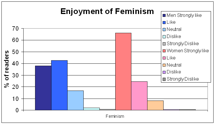 The only topic that differed between the sexes was Feminism:Women readers really like when I talk about feminism. Shocking, I know. Thankfully my male readers still generally like it! …Of course, I’ve probably scared off all the dudes who can’t stand it. Hm.
