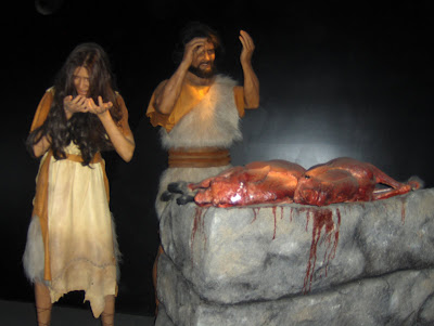 Now that Adam and Eve ate the fruit, the world’s about to go to crap. We rounded the corner and found this pleasant scene:A very kids-friendly museum! Of course, it’s alright to scare little kids if it teaches them to follow the Bible – think hell houses. This was also in a dark scary room, but the flash from my camera kind of ruins that feeling. Anyway, this is supposed to illustrate their shame of being naked, and how they need to make animal sacrifices to God to make him happy.