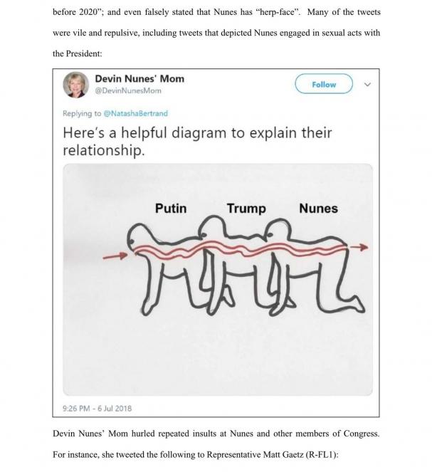 This led Wonkette, always a lover of the most destructive force in the universe, to ironically brand Nunes a cow-lover, and later and more explicitly, a cow-fucker. but it turns out that they were not the only ones. Someone, inspired by Wonkette or not, created a twitter account named Devin Nunes’ Cow. (Another?) someone also created an account called Devin Nunes’ Mom. Both were clearly parody accounts (cows rarely have internet access and the Mom account clearly labeled itself a parody account in the user description). Both were, unsurprisingly, rather disparaging of Devin Nunes’ performance in congress. Well, it turns out that as of today, Nunes has had enough.