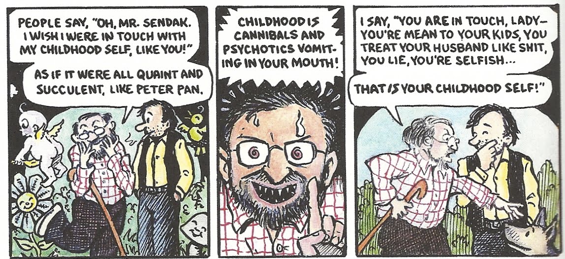 “People say, ‘Oh, Mr. Sendak. I wish I were in touch with my childhood self, like you!’ As if it were all quaint and succulent, like Peter Pan. Childhood is cannibals and psychotics vomiting in your mouth! I say, ‘You are in touch, lady–you’re mean to your kids, you treat your husband like shit, you lie, you’re selfish… That is your childhood self!”