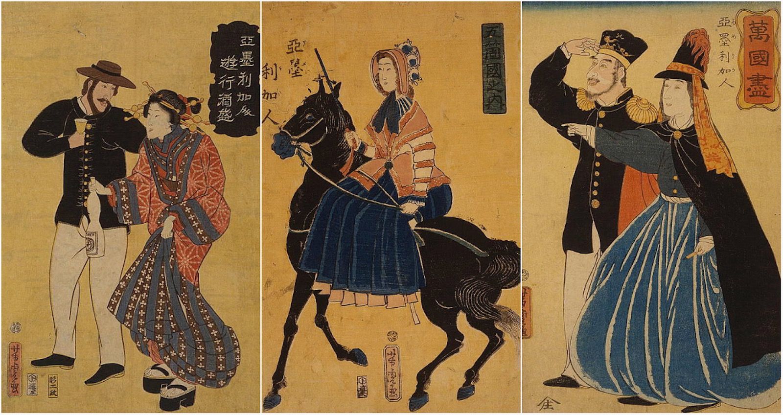 I mean, if you’re going to bring up Yokohama-e art, then there are quite a number of prints and paintings where white women have narrow, angled eyes and are instead differentiated by their noses, hair or clothing styles. Like this one which compares, from top to bottom, a French woman, an English woman, and a Qing Chinese woman. Here are four Americans (presumed white) and one Japanese person who all have eyes that could be seen as stereotypically “Asian” going by today’s standards. Overall, it seems like white men’s faces made more of an impression and that the artist of the time were struggling to find a way to depict the differences they saw, resulting in creative but inconsistent deviations from tradition.