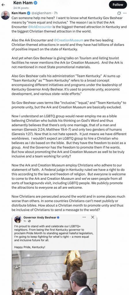 Ken Ham is spittin’ mad. Kentucky Governor Andy Beshear made a statement in support of LGBTQ+ people and the importance of inclusion…but he didn’t plug Ken Ham’s little roadside attraction! How dare he? He’s supposed to advertise the stupid wooden “boat” with every breath!