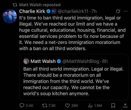 @charliekirk11 It’s time to ban third world immigration, legal or illegal. We’ve reached our limit and we have a huge cultural, educational, housing, financial, and essential services problem to fix now because of it. We need a net-zero immigration moratorium with a ban on all third worlders.