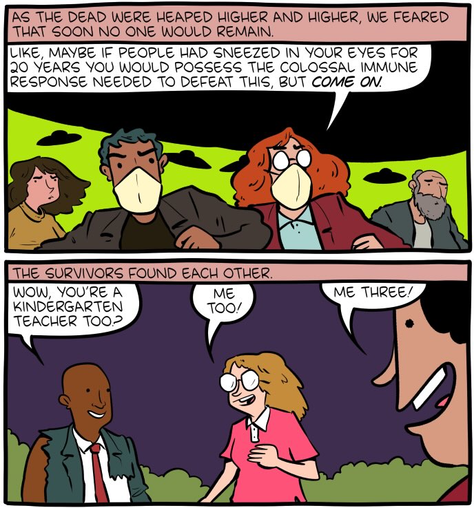 If alien invaders wanted to take over Earth, the most efficient strategy wouldn’t be to bomb things, or zap them with lasers; it would be to sow the planet with custom viruses that wipe out those pesky humans. To be really effective, they might want to indoctrinate the people psychologically to avoid basic prophylactic measures (this has already become a conspiracy theory). SMBC plays out this notion to its logical conclusion, and postulates that the triumphant survivors of this alien assault would be kindergarten teachers.