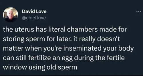 Female spiders possess structures in their reproductive tracts called spermathecae that are used to store sperm. Humans lack them, and in fact, the human female reproductive tract is hostile to the survival of sperm. From this, I am forced to surmise that David Love is, in fact, a spider — and further, a female spider.
