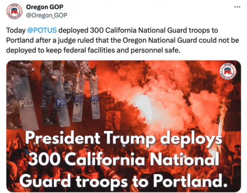 On all three platforms, the statement was illustrated with an image that seemed designed to support Trump’s false claim that protests against immigration sweeps in Portland are so out of control that the city is “burning to the ground”. On one side of the image, a line of police officers held riot shields; on the other, a crowd of young men held up flares that lit up a night sky filled with red smoke.
