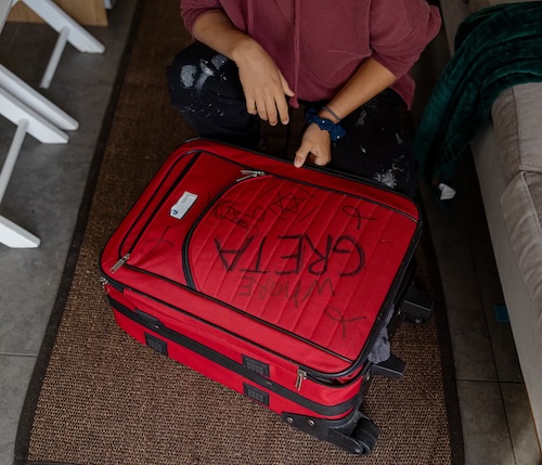 Her red suitcase lies in the hall. “Whore Greta” someone has written in large black letters. Around the text: an Israeli flag and an erect penis.