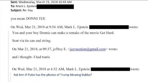 That’s Epstein’s brother asking him about some compromising photos; there was a flurry of speculation that “Bubba” was Clinton, in a verified email, but the brother has come forward to say it wasn’t the former president. Interesting…a partial denial suggests that the rest might be true, that Putin has some blackmail material on Trump.