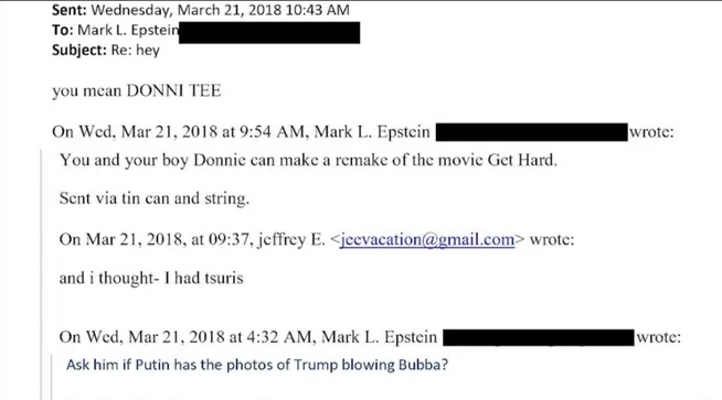 That’s Epstein’s brother asking him about some compromising photos; there was a flurry of speculation that “Bubba” was Clinton, in a verified email, but the brother has come forward to say it wasn’t the former president. Interesting…a partial denial suggests that the rest might be true, that Putin has some blackmail material on Trump.