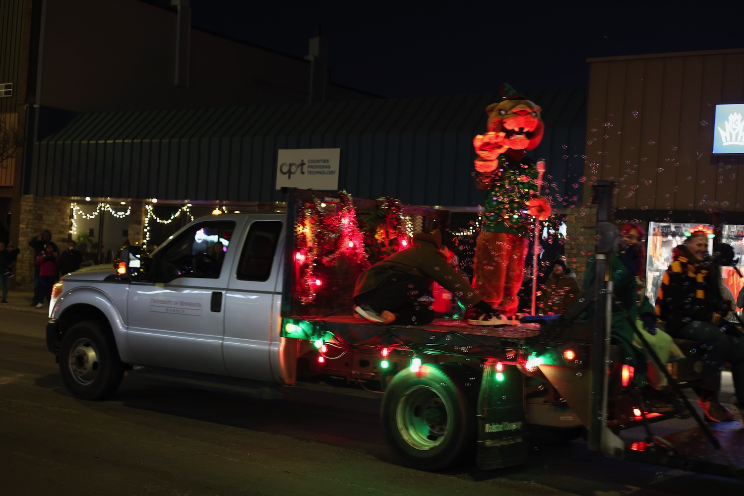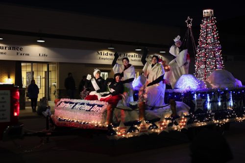 Every year, just before Thanksgiving, the city of Morris puts on a Parade of Lights, always in the dark and the bitter cold. The citizens line up along the streets, freezing our butts off, while hyper-excited kids are bouncing off the curb, waiting for the candy to start flying. Then along come the floats, with local beauty queens waving,
