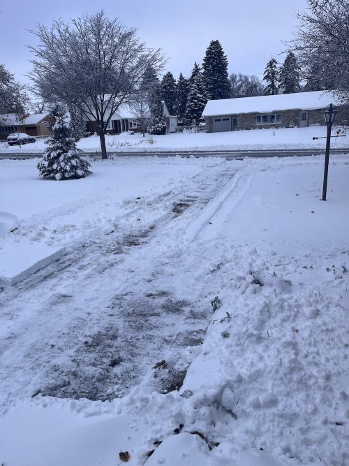 We tried clearing our driveway, but this stuff is wet, thick, and slushy, and it totally choked our snow blower. We could push forward maybe 2 meters before the snow blower froze up solid with ice and slush that it didn’t have enough power to push out. We ended up doing it old school, with snow shovels, but even that was impractical — the snow was so dense and sticky that it stuck to the snow shovel blade, and the shovel would just get heavier and heavier. We finally gave up, with the driveway incompletely clear, but it’s all we could do.