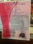 Remember this guy? A local chiropractor put up signs all around town touting “The Cancer Cure” (but taking care not to promise one, since he’s only a chiropractor). Those signs suddenly disappeared shortly after I complained, but it’s typical of these fringe wellness quacks — publicly veiling their promises while implying miracles. These guys are still in operation, of course, and still making bizarre claims, like that chiropractic allows the body to heal itself by removing any nervous system interference