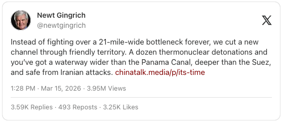 Instead of fighting over a 21-mile-wide bottleneck forever, we cut a new channel through friendly territory. A dozen thermonuclear detonations and you’ve got a waterway wider than the Panama Canal, deeper than the Suez, and safe from Iranian attacks.