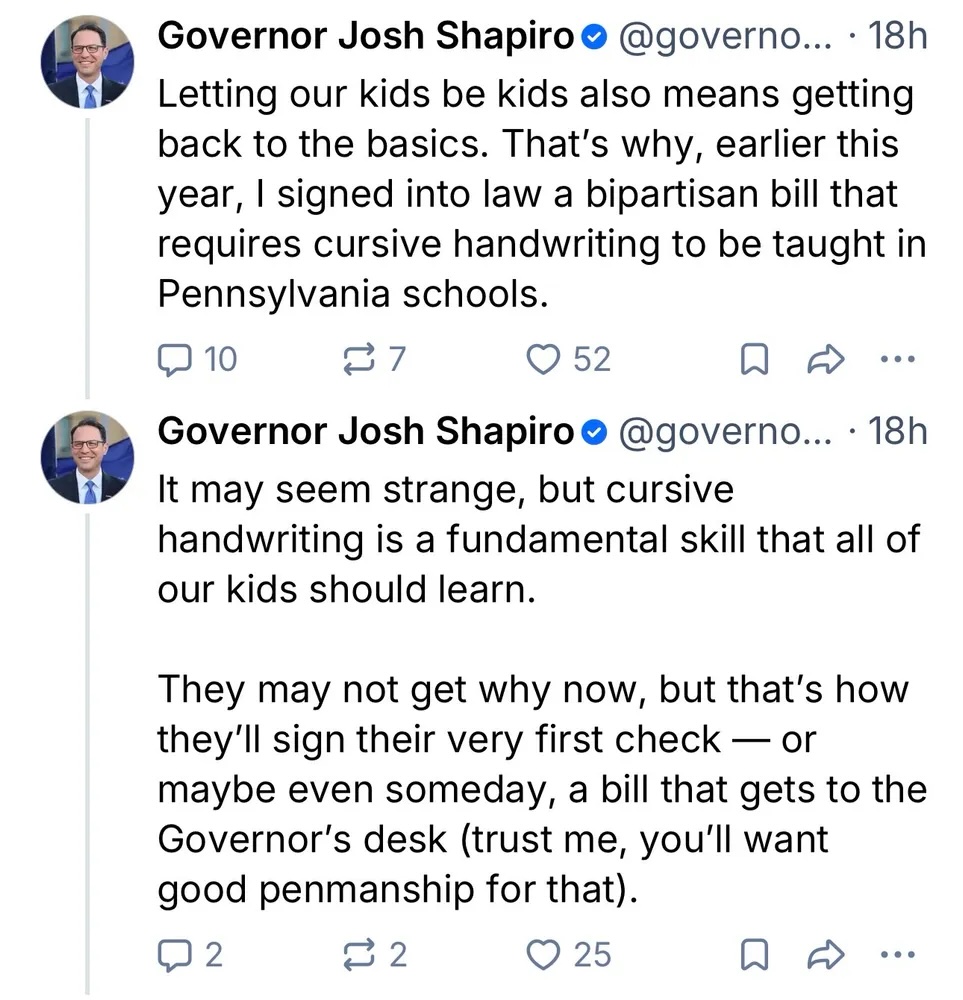 Governor Josh Shapiro of Pennsylvania has decided what kids in his state need to learn. It’s cursive handwriting.