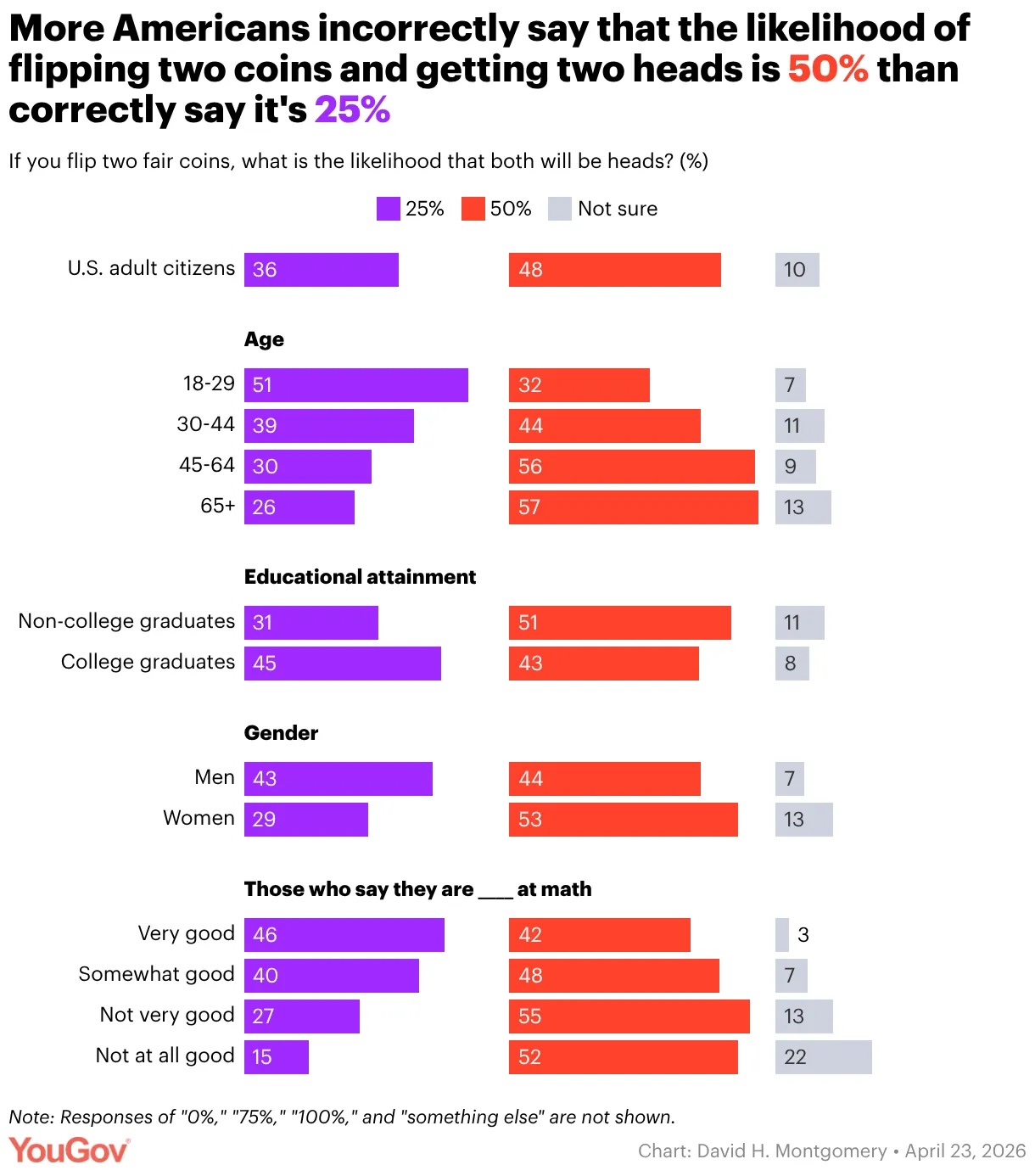 More Americans incorrectly say that the likelihood of flipping two coins and getting two heads is 50% than correctly say it’s 25%