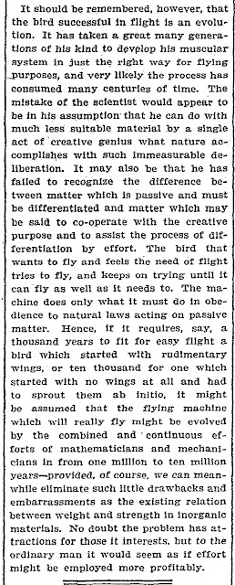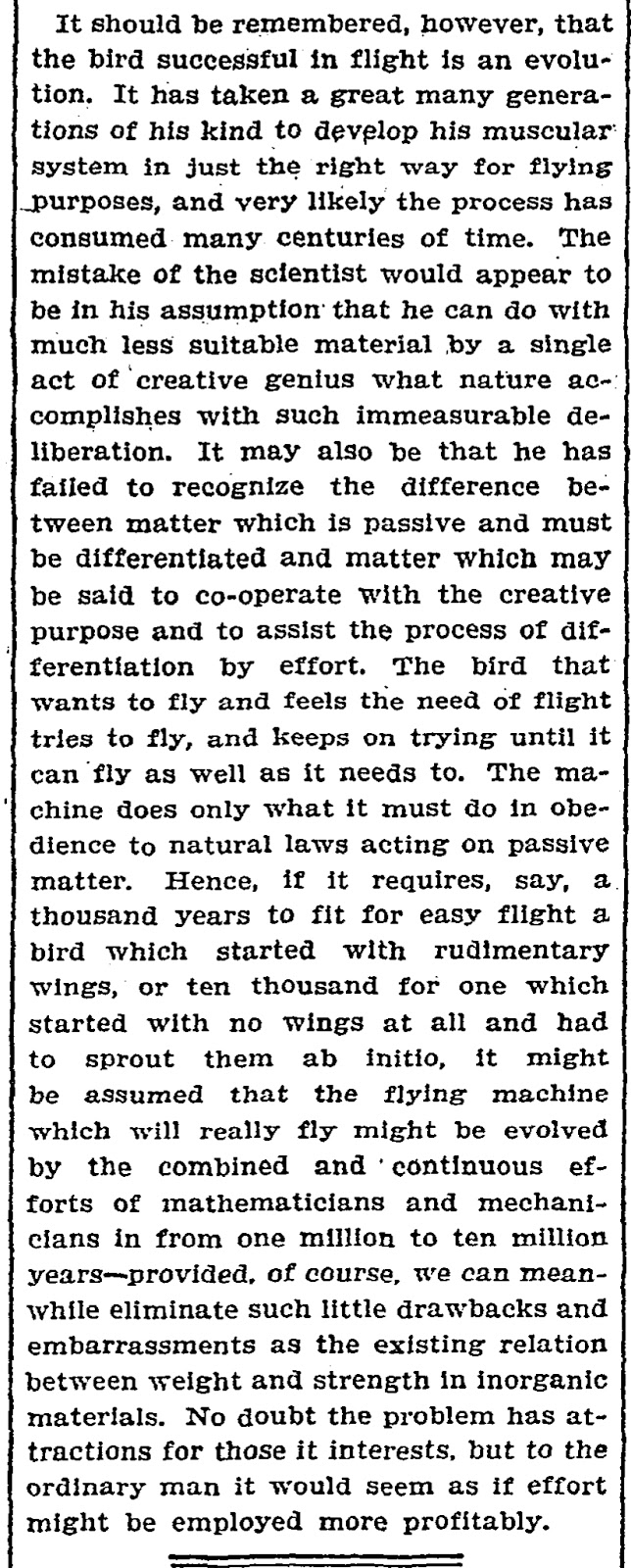 I can’t resist mentioning this truly delightful argument against powered mechanical flight, as published in the New York Times: